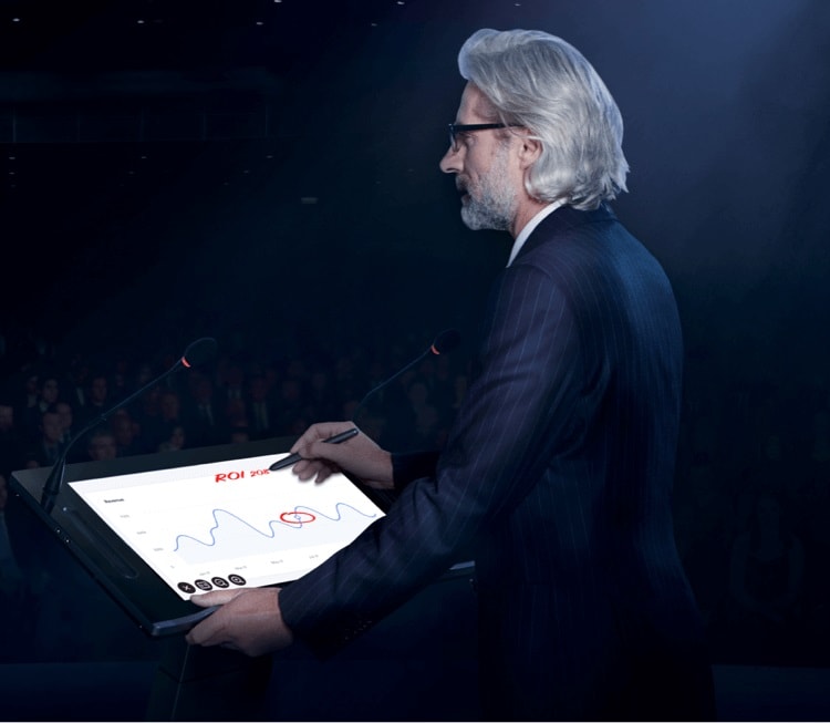 Với công nghệ cảm ứng điện dung, người dùng có thể tương tác trực tiếp trên màn hình của bục phát biểu thông minh Maxhub SL22MC bằng ngón tay hoặc bút cảm ứng, hỗ trợ ghi chú và chú thích trong thời gian thực, giúp bài thuyết trình trở nên sinh động và trực quan hơn. Nhờ tính năng này, người thuyết trình chỉ cần đứng một chỗ có thể điều khiển, ghi chú, viết vẽ và thông tin sẽ được truyền lên màn hình lớn phía sau sân khấu.