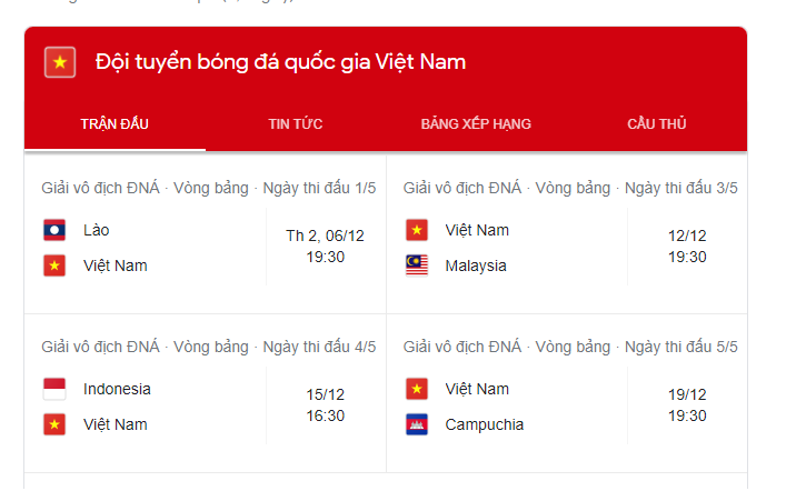 Hình ảnh lịch thi đấu của đội tuyển Việt Nam tại vòng bảng AFF CUP 2021