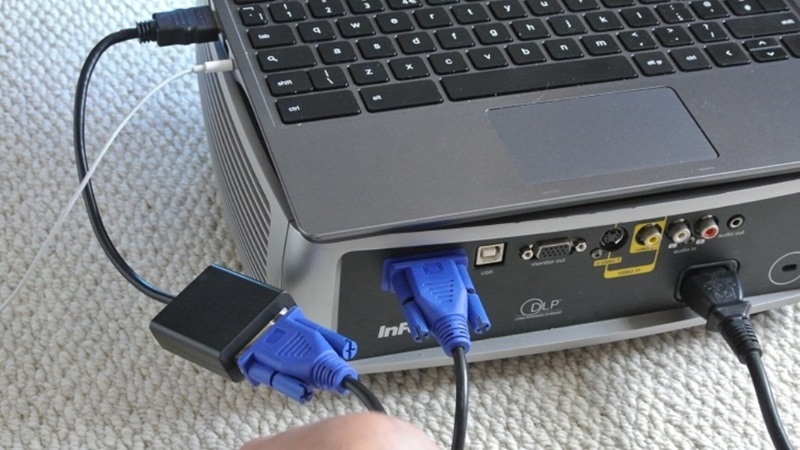Trước tiên ta cần tắt các thiết bị trước khi kết nối. Sau đó ta có thể sử dụng cáp VGA, hoặc cáp HDMI nếu là kết nối có dây cắm vào cổng có ký hiệu VGA/HDMI ở laptop và máy chiếu.