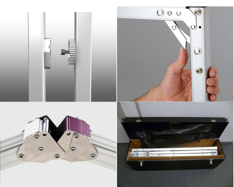 Để thuận tiện tháo lắp và cất trữ, nhà sản xuất còn trang bị một chiếc vali có bánh xe đi kèm màn chiếu. Người dùng dễ dàng mang đi lắp đặt và cất các bộ phận vào vali sau khi sử dụng, tránh tình trạng thất lạc.