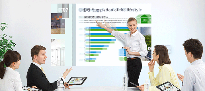 Với kết nối Wifi, bạn có thể không cần sử dụng đến các dây kết nối truyền thống như VGA và HDMi với nhược điểm rườm rà, tính di động không cao và dễ dàng trình chiếu từ mọi nơi trong phòng với kết nối không dây.