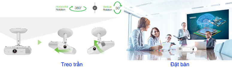 Sản phẩm có thể được lắp đặt linh hoạt với khả năng quay 360º. Bạn có thể lắp đặt trực tiếp máy chiếu lên bàn hoặc gắn lên trần nhà. Đối với gắn trên trần nhà, sản phẩm có thể chiếu từ mọi góc qua xoay ngang 360º hoặc xoay dọc 30º.