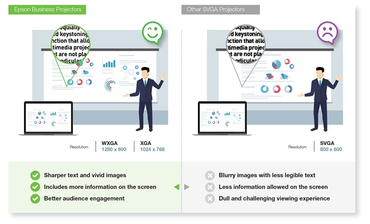 Máy có độ phân giải WXGA (1280 x 800), đem đến chất lượng hình ảnh sắc nét, chân thực. Độ tương phản 16.000:1 mang lại khả năng trình chiếu văn bản hoàn hảo, mọi chi tiết chiếu ra luôn đảm bảo rõ ràng, thích hợp sử dụng trong văn phòng, lớp học.