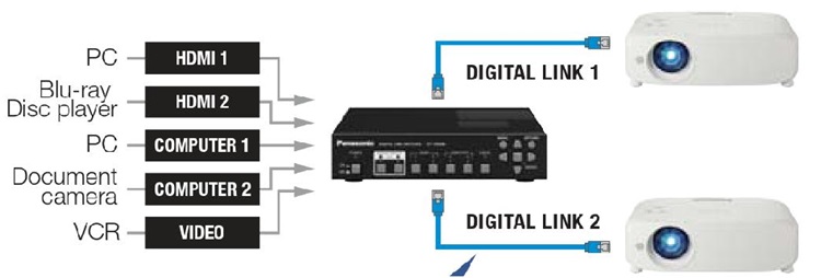 Digital Link truyền các lệnh video, âm thanh và điều khiển không nén thông qua cáp STP CAT 5e hoặc cao cấp hơn cho khoảng cách lên tới 150m ở Chế độ tầm xa. Bộ chuyển đổi liên kết kỹ thuật số hoặc hộp giao diện kỹ thuật số tùy chọn giúp giảm cáp và chi phí liên quan bằng cách kết nối nhiều thiết bị nguồn và truyền tín hiệu đến máy chiếu thông qua một cáp.