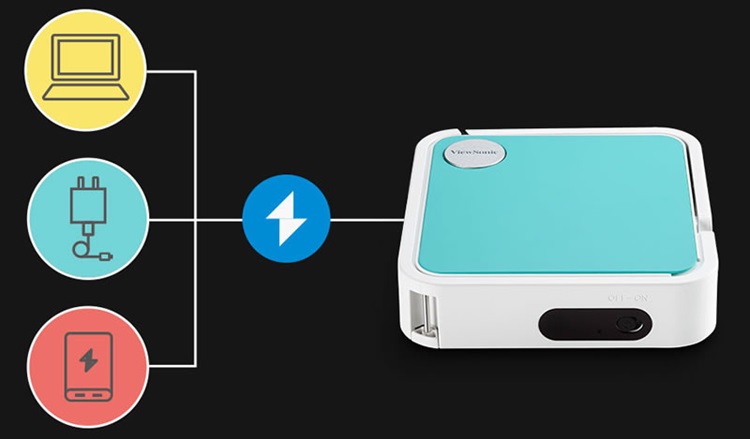 Bên cạnh đó, ViewSonic M1+ được trang bị một bộ nguồn sạc tích hợp, với thời lượng trình chiếu lên đến 6 giờ. Đây là ưu điểm vượt trội giúp người dùng không cần phải mang theo dây nguồn đi kèm máy chiếu mỗi khi sử dụng bên ngoài.