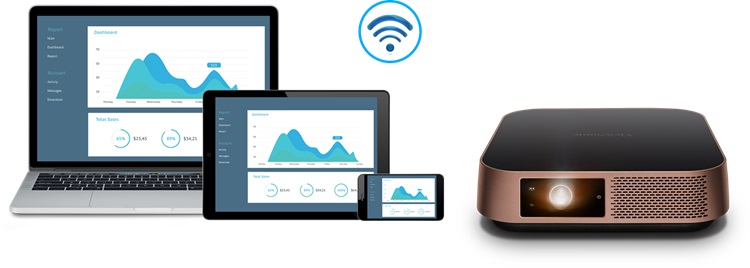 Ngoài ra, việc tích hợp Wifi trên sản phẩm giúp người dùng có thể dễ dàng chia sẻ dữ liệu từ điện thoại. Kết hợp cùng giao diện Smart TV thân thiện phục vụ cho nhu cầu giải trí online đa phương tiện. ViewSonic M2 được trang bị trợ lý giọng nói ảo Google Assistant và Amazon Alexa hỗ trợ người dùng điều khiển thiết bị từ xa bằng giọng nói. Giúp bạn có thể sử dụng dễ dàng trong những chuyến du lịch, dã ngoại hay tiệc ngoài trời…