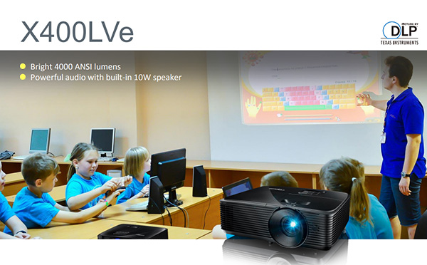 Optoma X400LVE là mẫu máy chiếu giá rẻ lý tưởng cho không gian văn phòng và lớp học, được thiết kế nâng cấp từ mẫu máy chiếu Optoma SA500. Máy sử dụng công nghệ xử lý hình ảnh hiện đại với chip DLP thế hệ mới, mang lại độ sáng lên đến 4.000 Ansi Lumens, giúp hình ảnh trở nên rõ nét hơn. Đèn chiếu của Optoma X400LVE có tuổi thọ ấn tượng lên tới 15.000 giờ.