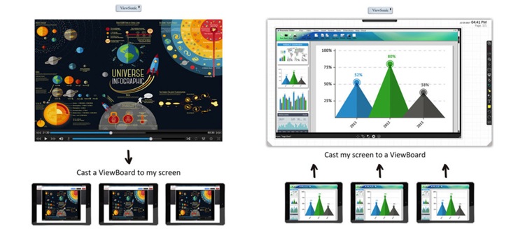 Sử dụng tính năng ViewBoard Cast cho phép giáo viên và học sinh chia sẻ nội dung giữa các thiết bị được kết nối đồng thời qua internet và nó cũng có thể được sử dụng cho giao tiếp từ xa với sinh viên không có mặt trực tiếp tại lớp học. Đây là ưu điểm nổi bật của máy chiếu tương tác ViewSonic PS750W, giúp cho việc trở học tập trở nên thú vị với những phương tiện trực quan sinh động: hình ảnh, video,…