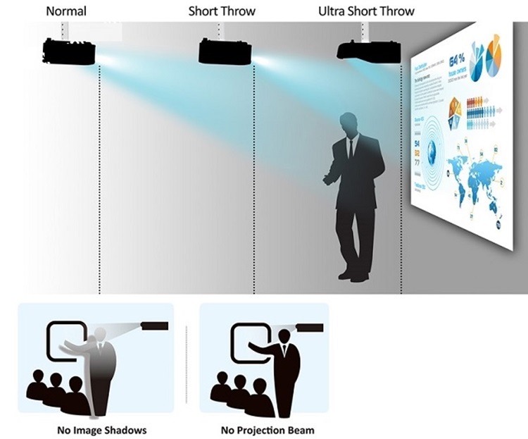 Máy chiếu có ống kính siêu gần, mang lại khả năng trình chiếu lên khung hình 100 inch siêu rộng ở khoảng cách chỉ 0.16m vượt trội so với các dòng máy chiếu thông thường khác. Với khoảng cách chiếu gần, buổi thuyết trình sẽ được diễn ra suôn sẻ mà không bị gián đoạn bởi hình ảnh bị che lấp khi người thuyết trình di chuyển qua lại để tương tác với người xem.