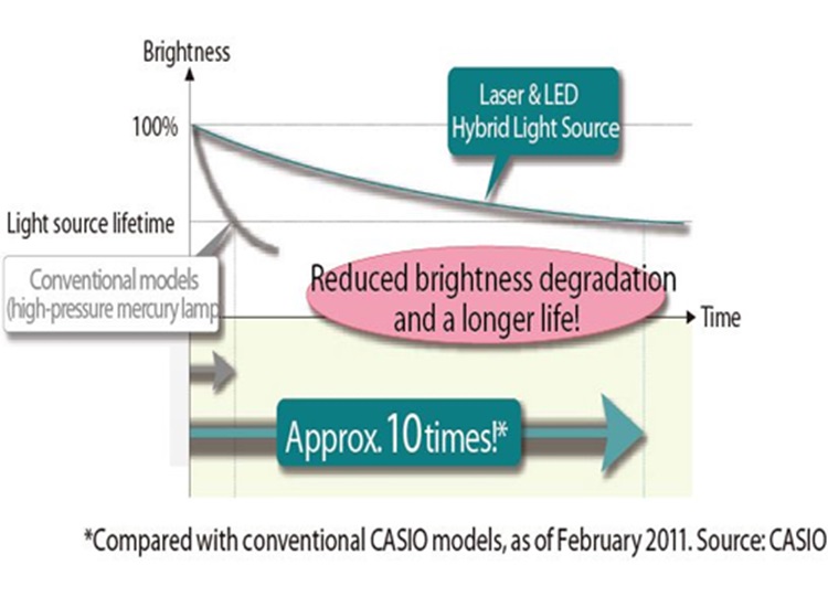 Với việc chọn hệ thống nguồn sáng dựa trên chất bán dẫn mới kết hợp ánh sáng laser màu lam, phốt pho và LED đỏ, Casio đạt được cả hiệu năng độ sáng cao cho phép trình chiếu trong các phòng nhiều ánh sáng và thân thiện với môi trường khi loại bỏ thủy ngân khỏi nguồn sáng.