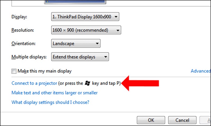 Hiển thị giao diện mới nhấn tiếp vào Connect to a projector (or press the key and tap P). Hoặc người dùng có thể nhấn tổ hợp phím Windows + P để mở giao diện lựa chọn kiểu kết nối màn hình.