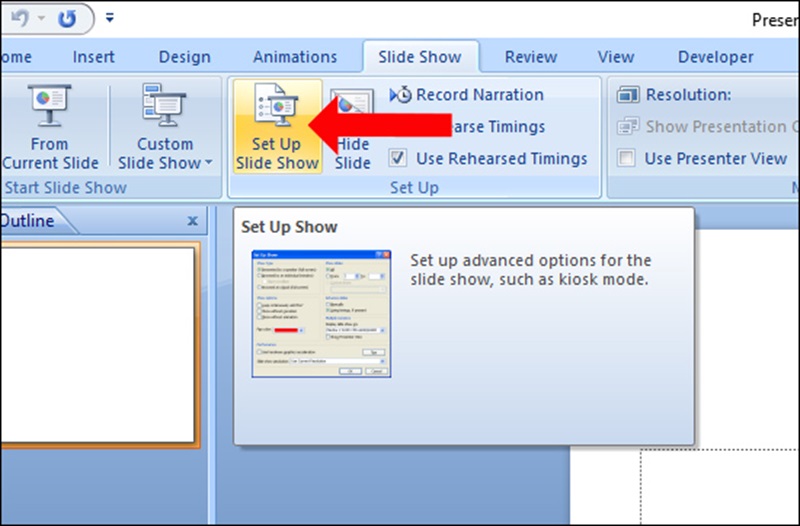 Bước 4: Mở giao diện PowerPoint rồi nhấn tiếp vào tab Slide Show. Tiếp đó người dùng nhấn vào mục Set Up Slide Show bên dưới.
