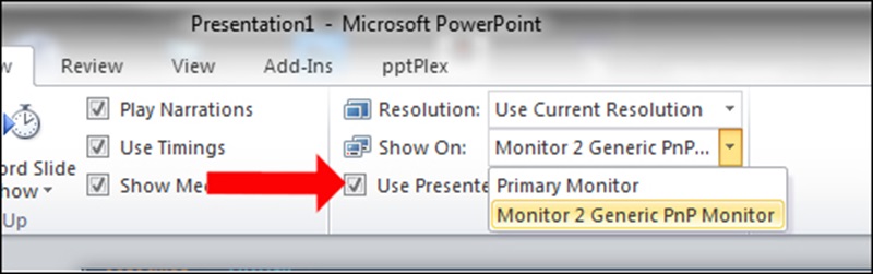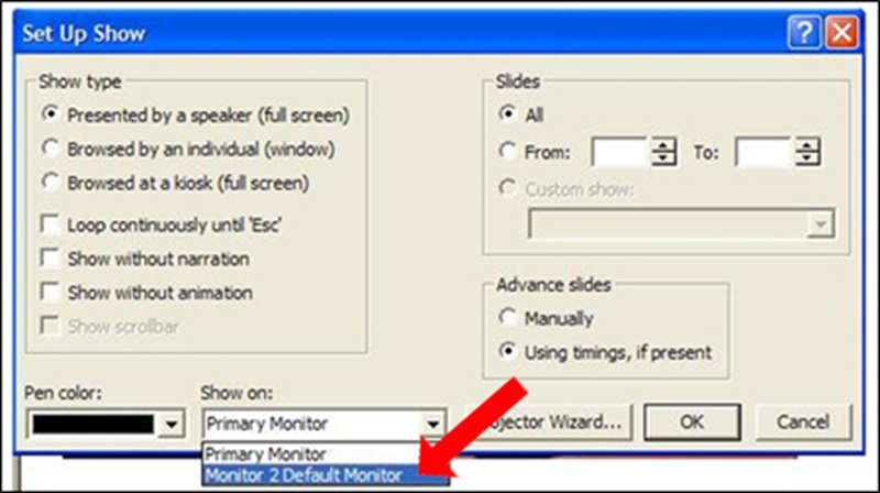 Với một số phiên bản PowerPoint mới hơn chúng ta có thể nhấn vào Show On và cũng chọn Monitor 2.