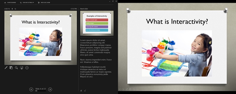 Bước 5: Cuối cùng bạn nhấn F5 rồi mở slide để trình chiếu. Kết quả màn hình trên máy chiếu sẽ chỉ hiển thị nội dung trên slide hoặc là màn hình máy tính. Còn màn hình laptop sẽ hiện nội dung slide đang chiếu, phần ghi chú hoặc bất cứ nội dung nào nhưng người xem không hề nhìn thấy vì không hiện trên màn hình máy chiếu.