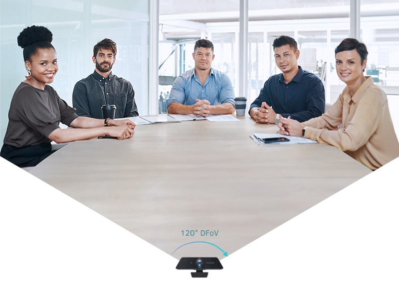 Góc nhìn siêu rộng 120° giúp camera bao quát được phạm vi lớn. Điều này đặc biệt hữu ích với những phòng họp thiết kế có vị trí ngồi họp phải ngồi sát camera. Việc có góc nhìn rộng giúp những người ngồi sát camera vẫn có thể thu được khung hình, hạn chế góc chết.